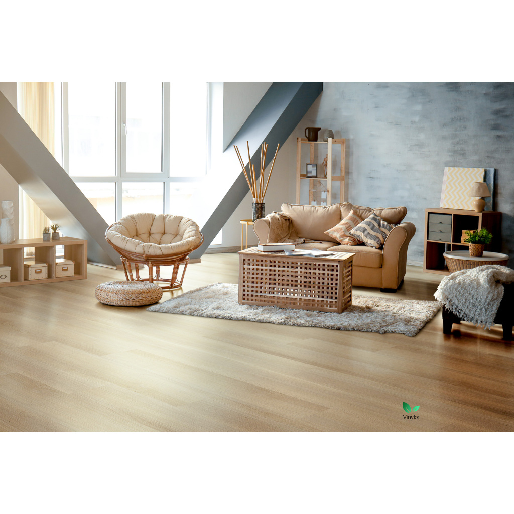 Vinylová podlaha s Click systémem, celková tloušťka 4,5 mm, z toho: nášlapná vrstva je 0,3 mm, 1 mm integrovaná podložka EVA, zkosené hrany po všech 4 stranách. Rigidní SPC vinylové dílce