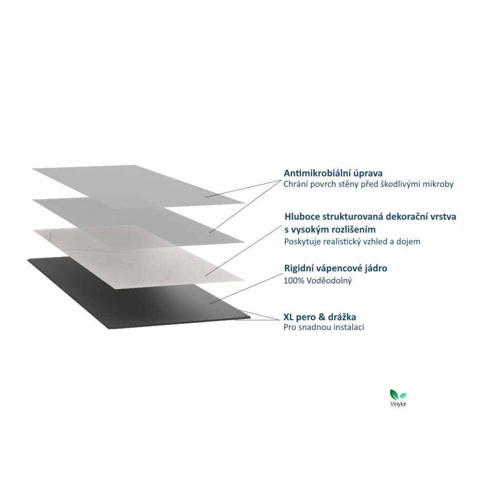 Panely mají tloušťku 4 mm a jejich pevné kompozitní jádro tvoří směs kamene a PVC. Tento základ je pokryt dekorativní vrstvou a chráněn UV odolnou vrstvou, která zaručuje dlouhou životnost i při vystavení slunečnímu záření.