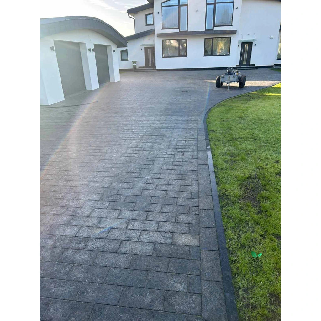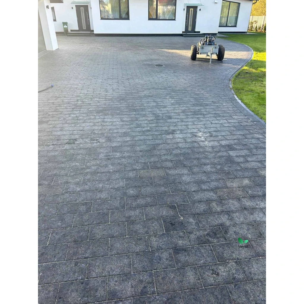 Materiál je přírodní žula Volga Blue s vysokou odolností proti mrazu, vodě i mechanickému zatížení. Flambovaná horní strana poskytuje vynikající protiskluzové vlastnosti, což z těchto kostek dělá bezpečné a dlouhodobě spolehlivé řešení pro venkovní použití.